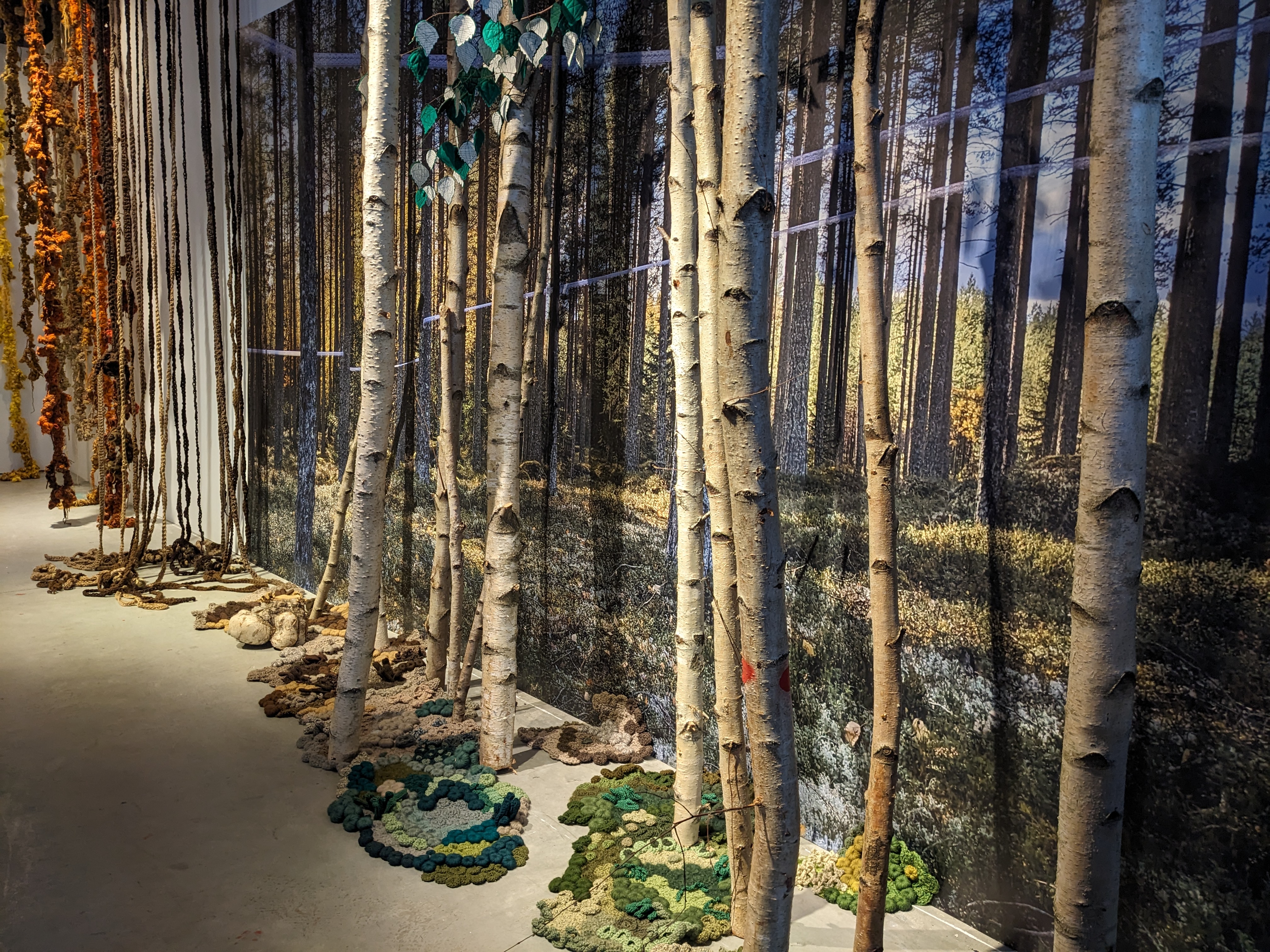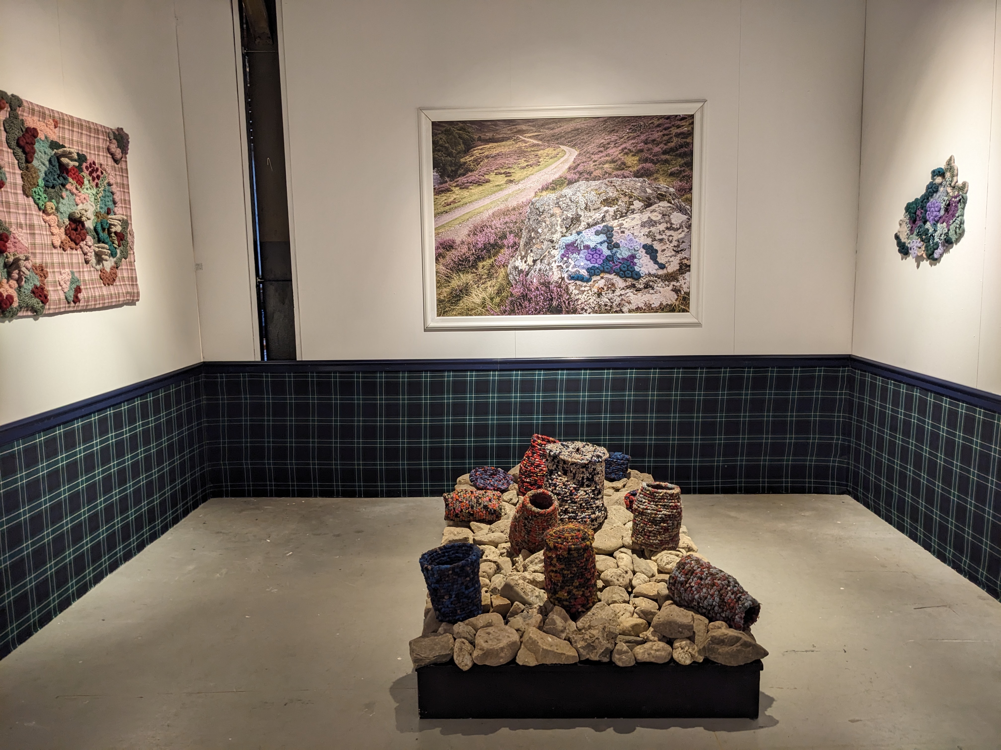 Exhibition of textile artworks with natural elements.