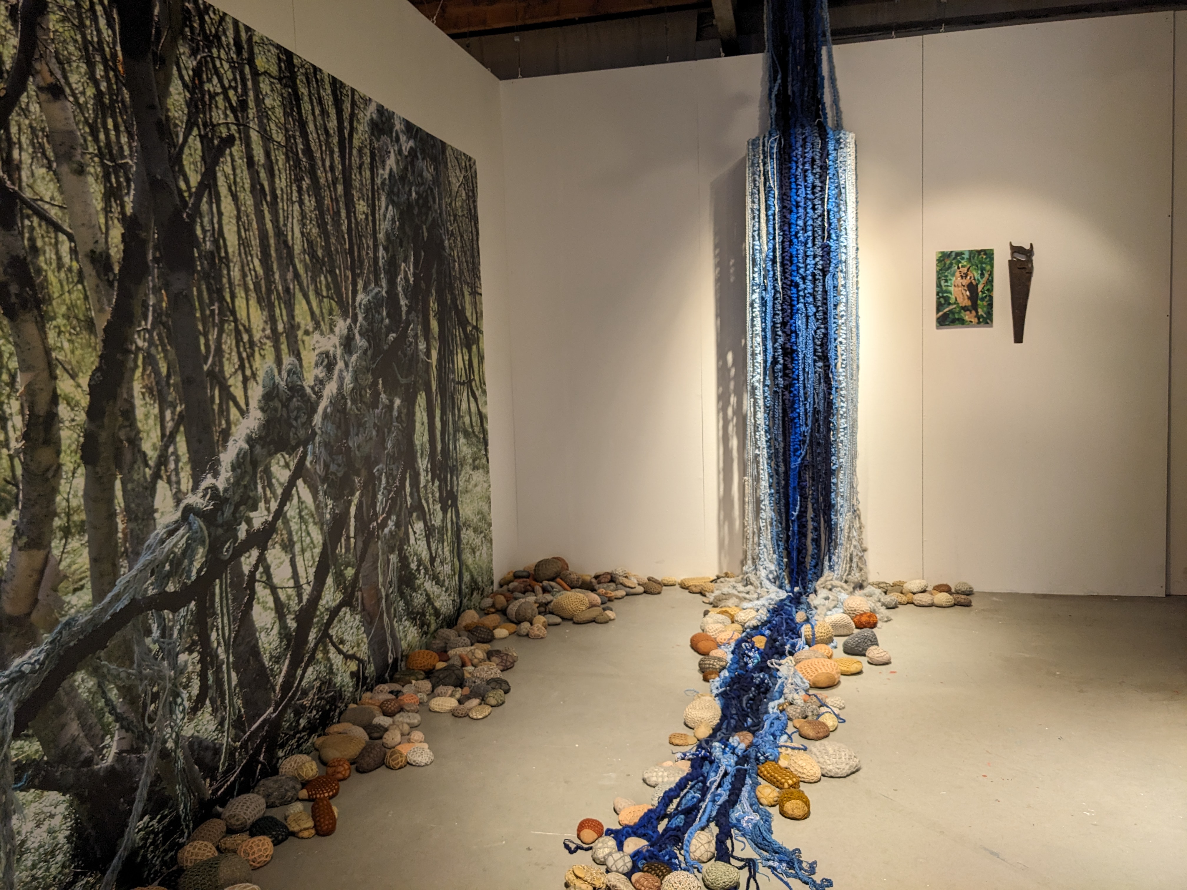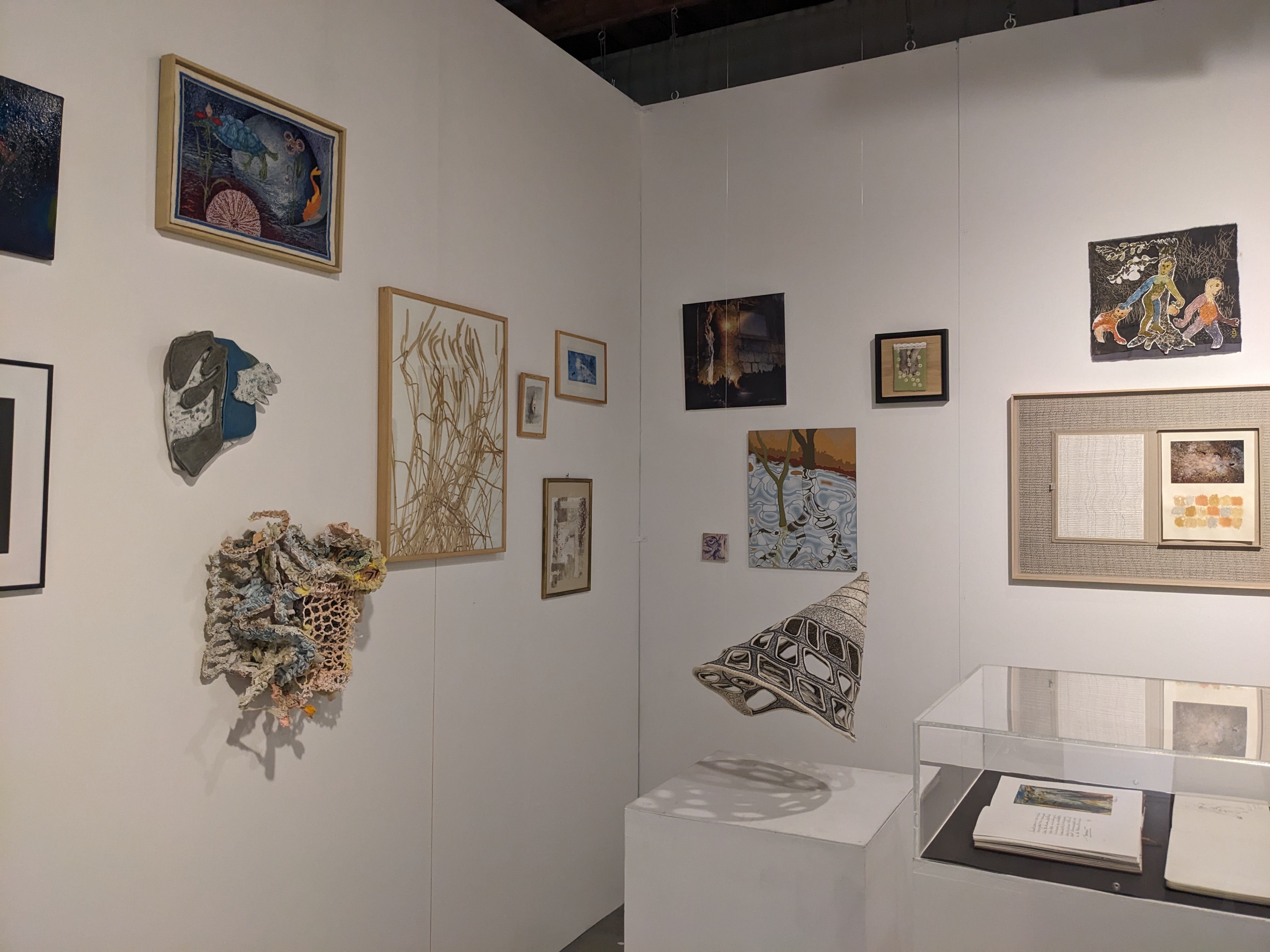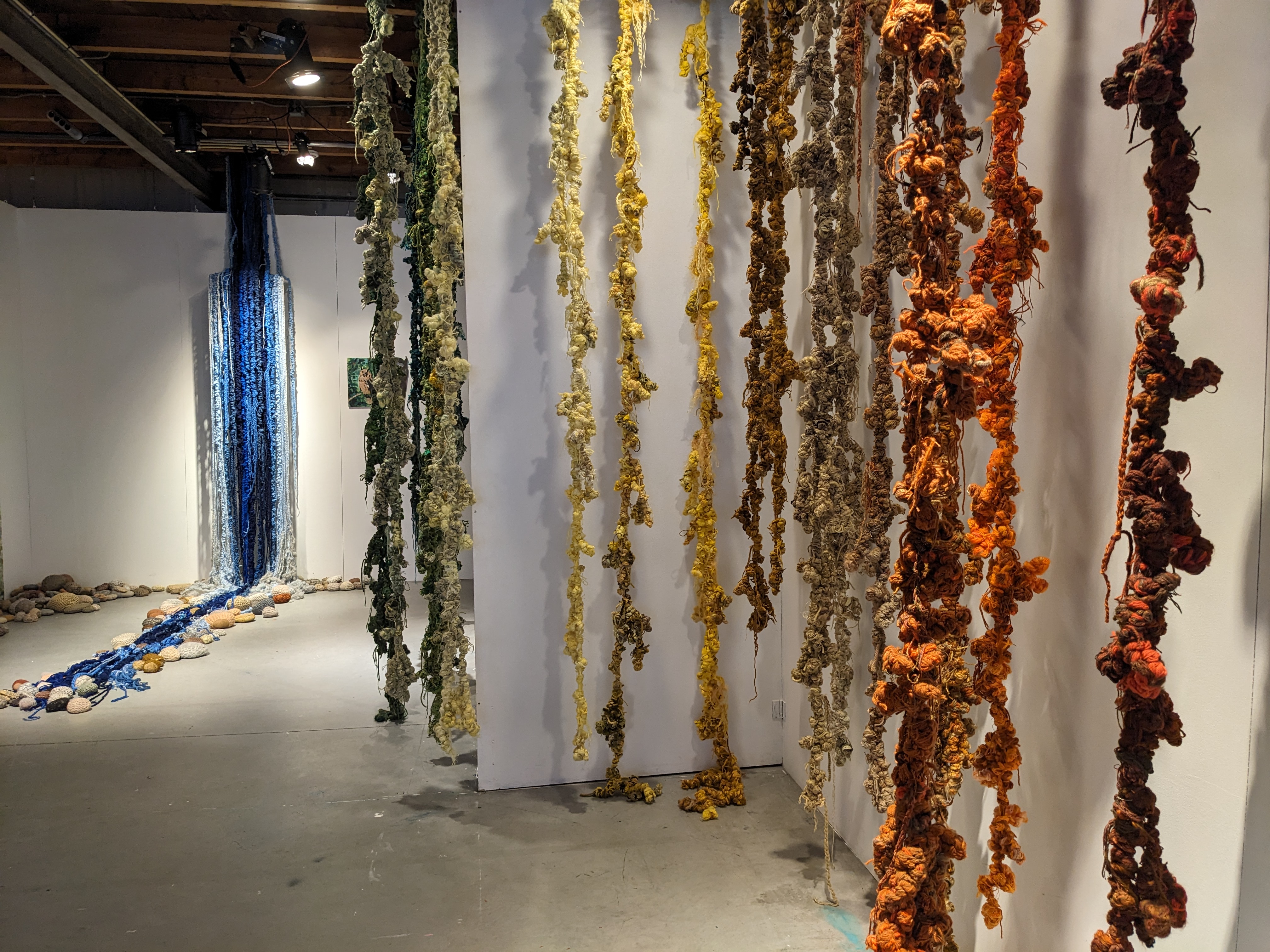 Exhibition of textile artworks with natural elements and paintings.