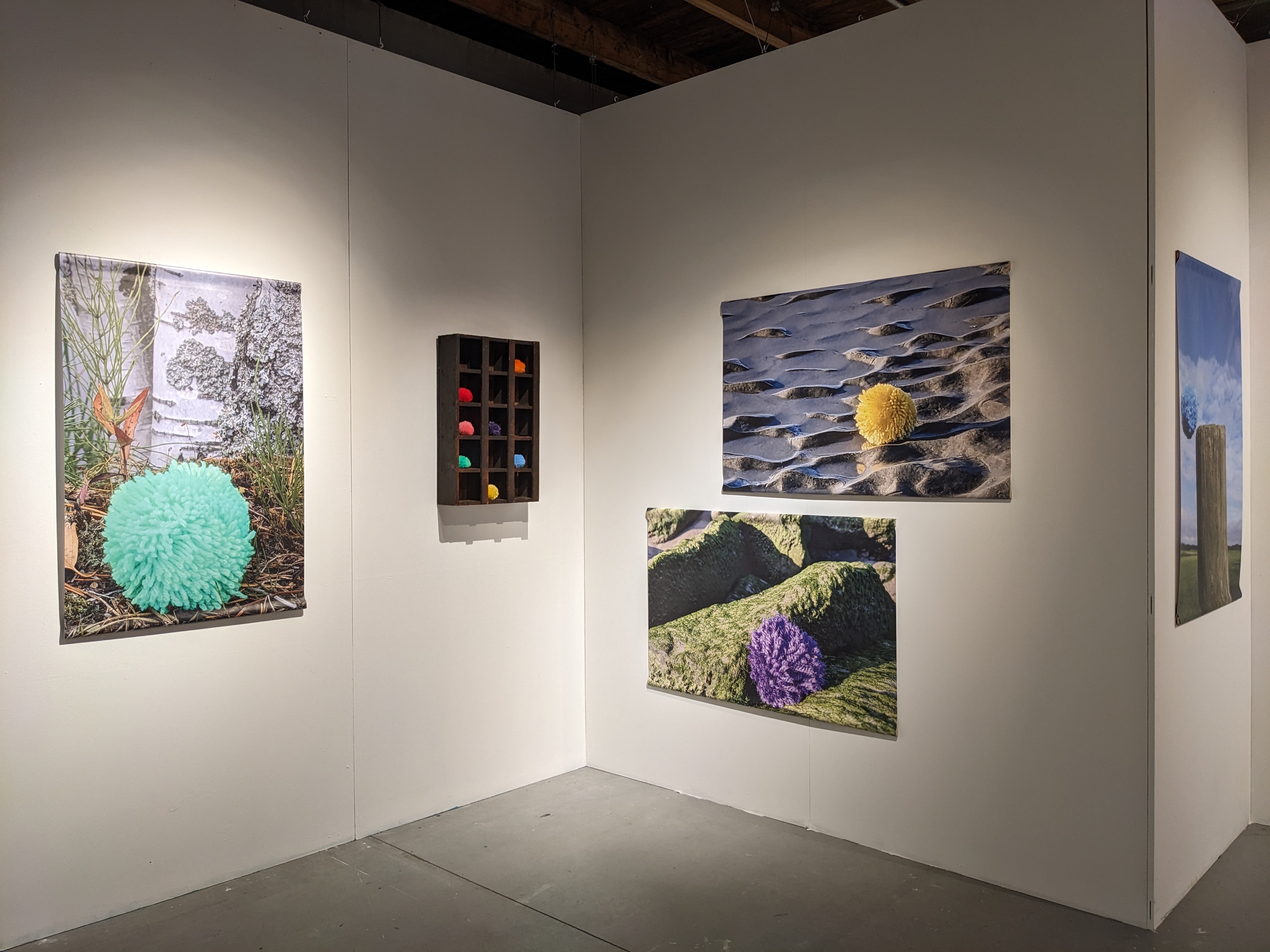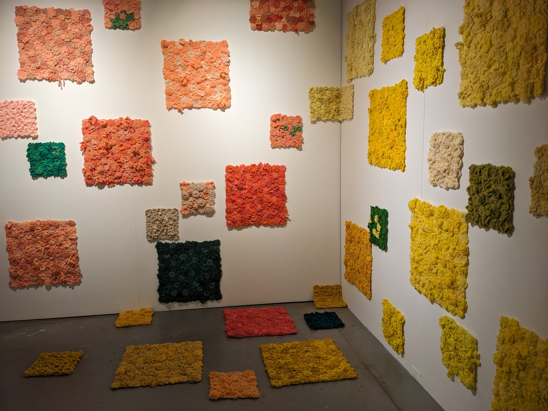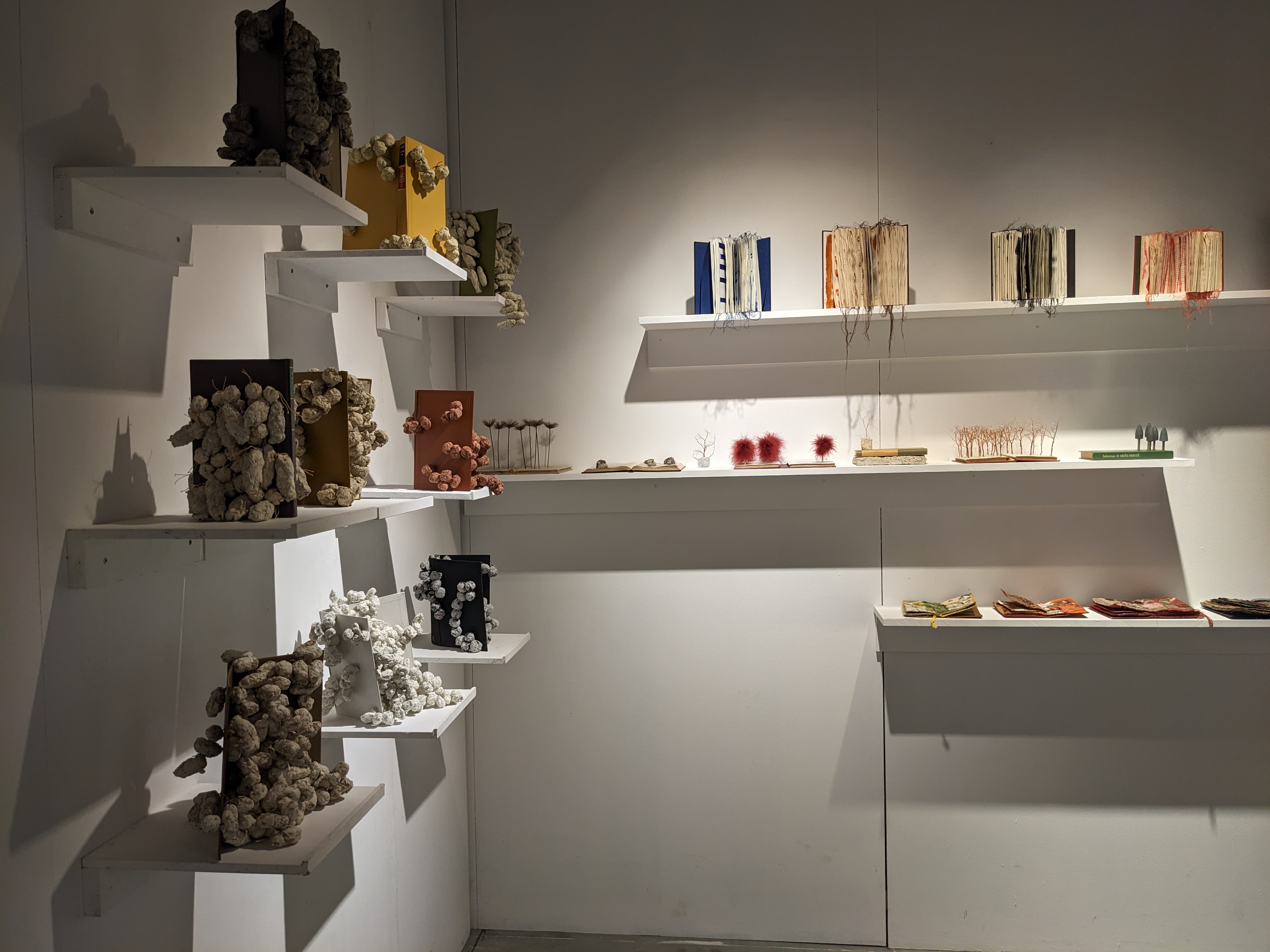 Exhibition of textile artworks with natural elements and paintings.